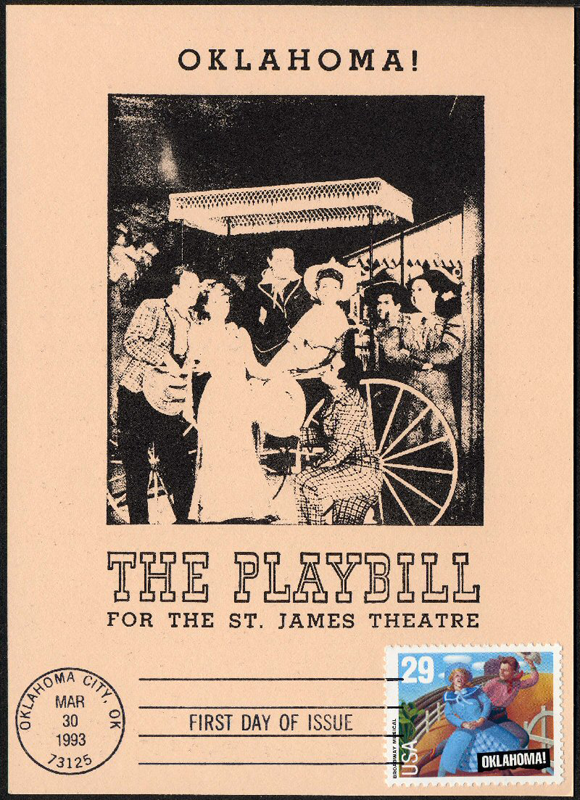 Sc. 2722 Oklahoma! on a 5"x7" black on salmon Dragon Card reproducing the opening night playbill (program); text on back. Great for a music-, theater-, Broadway- or entertainment-on-stamps collection!