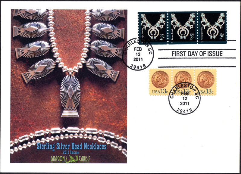 Navajo sterling silver bead necklaces. Strip of 3 stamps, plus 3 of Sc.