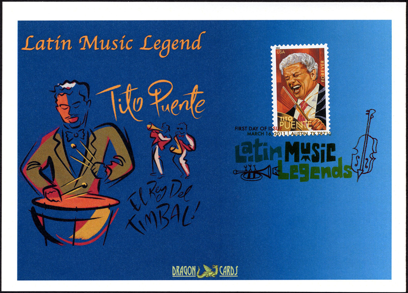 Sc. 4497 Latin Music - Puente on a 5"x7" Dragon Card reproducing album art, a stylized picture of Puente. Digital color postmark. Great for a music- or Hispanic culture-on-stamps collection! Back To