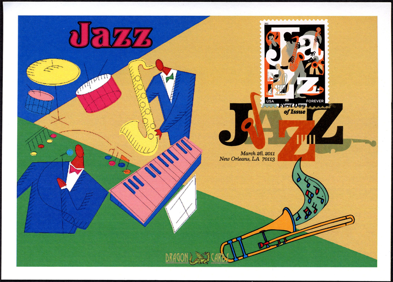 Sc. 4503 Jazz on a 5"x7" Dragon Card with abstract art of jazz musicians. Digital Color Postmark. Great for a jazz- or music-on-stamps collection! Back To
