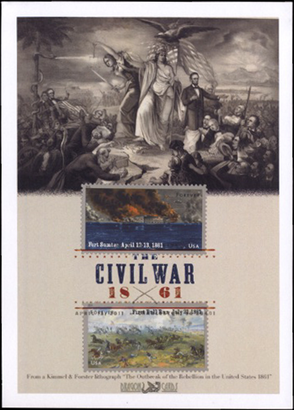 Sc. 4522-3 Civil War on a 5”x7” Dragon card reproducing a period lithograph, “Outbreak of the Rebellion.” Both stamps are affixed and tied by the Digital Color Postmark. Great for a Civil War- or military-on-stamps collection!