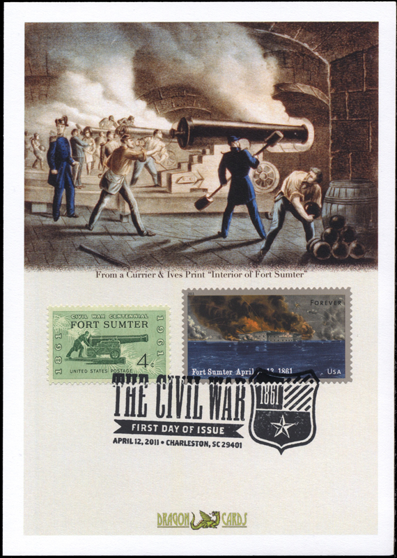Sc. 4522 Civil War - Sumter on a 5”x7” Dragon Card reproducing a Currier & Ives print. With the 1961 Fort Sumter stamp (Sc. 1178), First Day of Issue hand cancel. Great for a Civil War- or military-on-stamps collection!