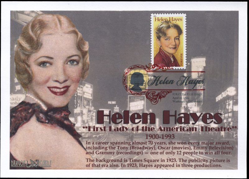 Sc. 4525 Helen Hayes on a 5”x7” Dragon Card reproducing a publicity picture of Hayes about 1923, with a background of Times Square (Broadway) in 1923. Digital Color Postmark. Great for a theater- or entertainment-on-stamps collection!