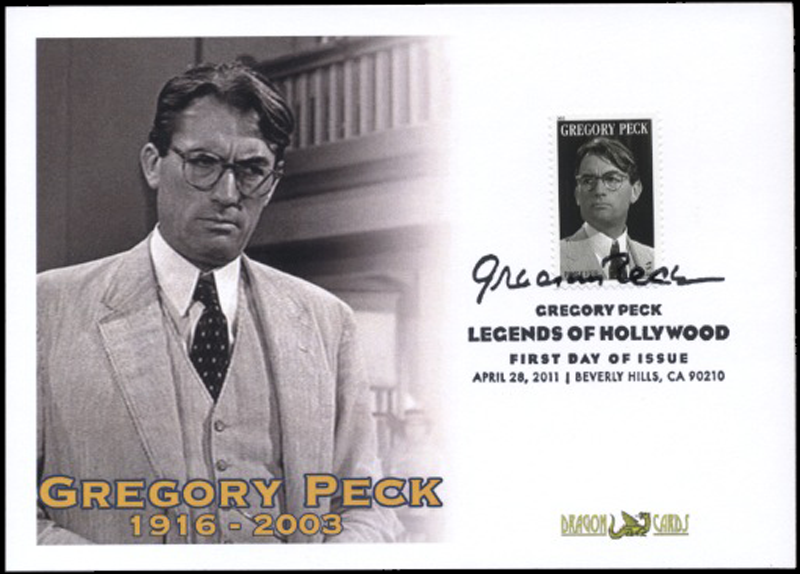 Sc. 4526 Gregory Peck on a 5”x7” Dragon Card showing Atticus Finch (Peck) in thought during the courtroom scene of “To Kill A Mockingbird.” First Day of Issue hand cancel. Great for a movies- or entertainment-on-stamps collection!
