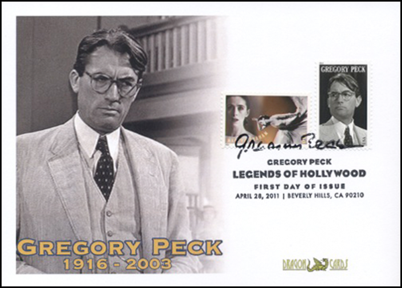 Sc. 4526 Gregory Peck on a 5"x7" Dragon Card showing Atticus Finch (Peck) in thought during the courtroom scene of "To Kill A Mockingbird." With Martha Graham/Choreographers stamp (Sc. 384). In 1940, Peck was a student at the Neighborhood Playhouse in New York and Graham was a movement instructor. One day she felt he wasn't stretching enough. "Come along, Greg, you can do better than that," she said, and put her knee in his back, and pushed. There was a loud pop, and Peck had a ruptured disk and displaced vertebra. That injury kept Peck out of World War II, and he was able to establish himself as a young leading actor while others were in the military. Also, his daughter Cecilia danced for Martha Graham's company. Great for a movies- or entertainment-on-stamps collection!
