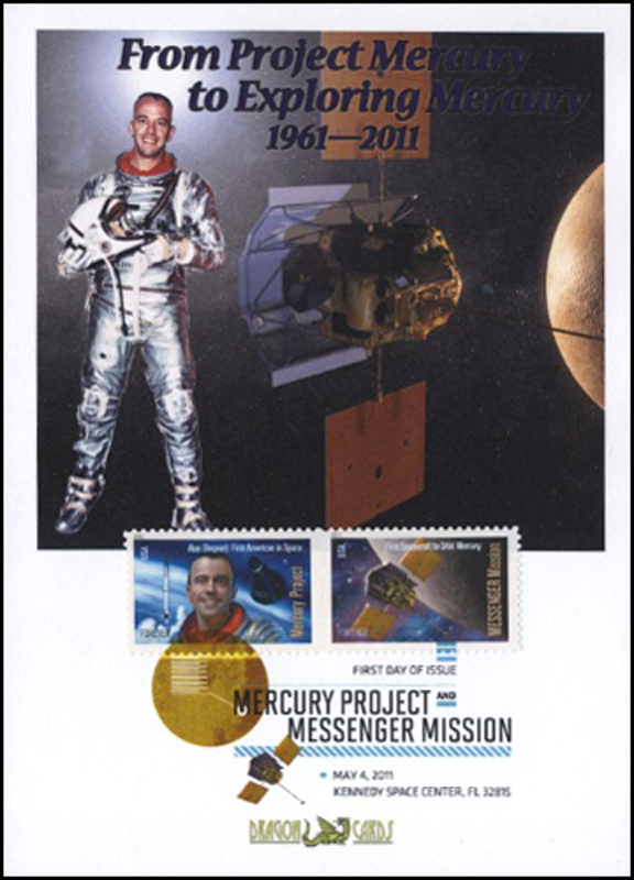 ![]() First Day Cover Mercury Dgn 409 $4.50 Sc. 4527-8 Mercury on a 5"x7" Dragon Card with a montage of Alan Shepard and an artist's conception of the MESSENGER probe orbiting Mercury. Se-tenant pair of stamps plus the Digital Color Postmark. Great for a space-on-stamps collection! |
