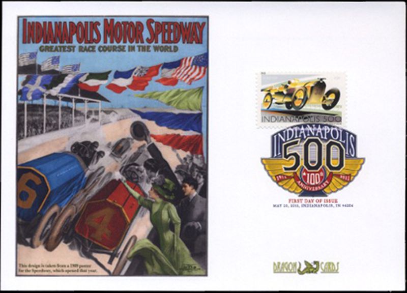 Sc. 4530 Indianapolis 500 on a 5"x7" Dragon Card based on a colorized poster for the Indianapolis Motor Speedway in 1909, the year it opened. Digital Color Postmark. Great for an auto racing- or cars-on-stamps collection! Back To