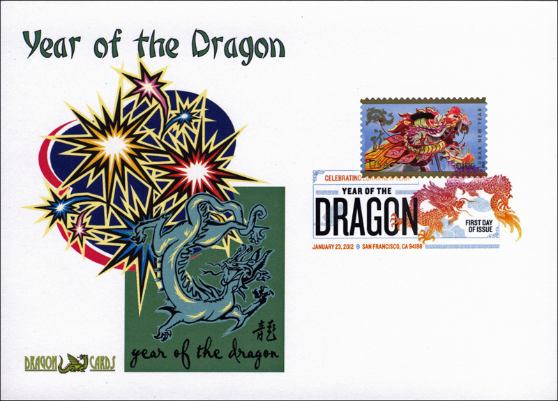 Sc. 4623 Year of the Dragon on a 5"x7" Dragon Card showing a Year of the Dragon icon and fireworks. Digital Color Postmark. Great for a dragons-, animals- or Lunar Holidays-on-stamps collection!