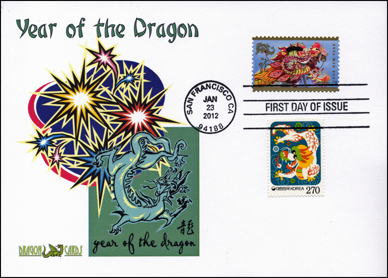 Sc. 4623 Year of the Dragon on a 5"x7" Dragon Card showing a Year of the Dragon icon and fireworks. U.S. First Day of Issue hand cancel ties U.S. and Korea stamps. Great for a dragons-, animals- or Lunar Holidays-on-stamps collection!