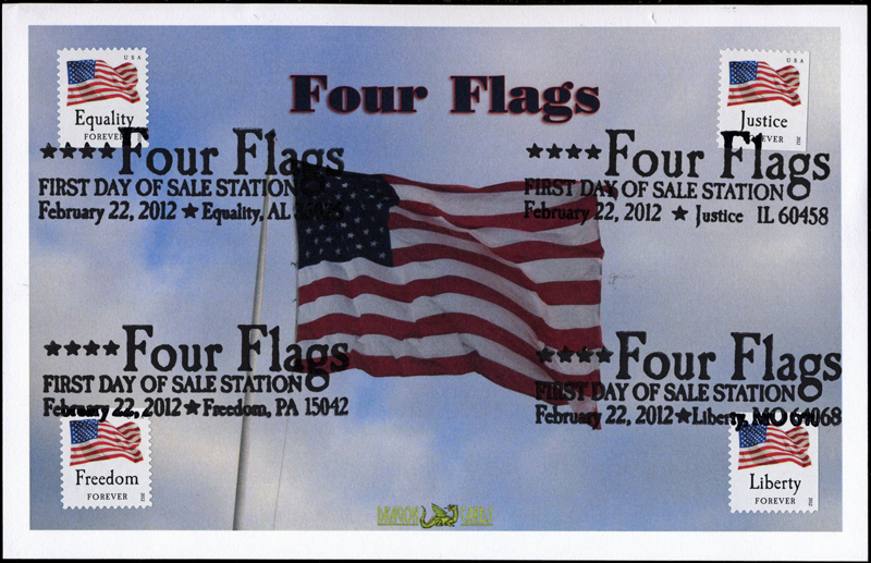 Sc. 4641-4 Four Flags on a 5½"x8½" Dragon Card featuring a large flag flying in a partly-cloudy sky. Each of the four stamps in the corners is tied by the First Day of Sale postmark for a city with the same name: Equality, AL; Freedom, PA; Justice, IL; and Liberty MO. Great for a flags-on-stamps collection!
