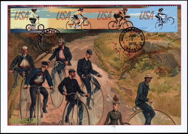 Sc. 4687-90 Bicycling on a 5"x7" Dragon Card reproducing a L. Prang & Co. print from about 1887 of high-wheel cyclists on a rural road. Se-tenant strip of 4 is tied by two circular date stamp first-day cancels. Great for a bicycling- or sports-on-stamps collection!