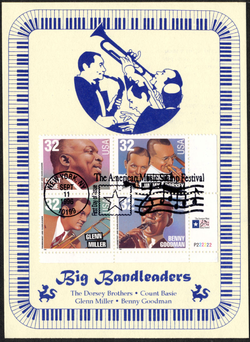 Sc. 3096a Big Bandleaders with a plate block of 4; 10 produced. Great for a music- or jazz-on-stamps collection!
