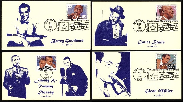 Sc. 3096-3099 Big Bandleaders on a set of 4 FDC-size cards, blue on cream, one for each stamp with photos of the leaders. Great for a music-, swing- or jazz-on-stamps collection!