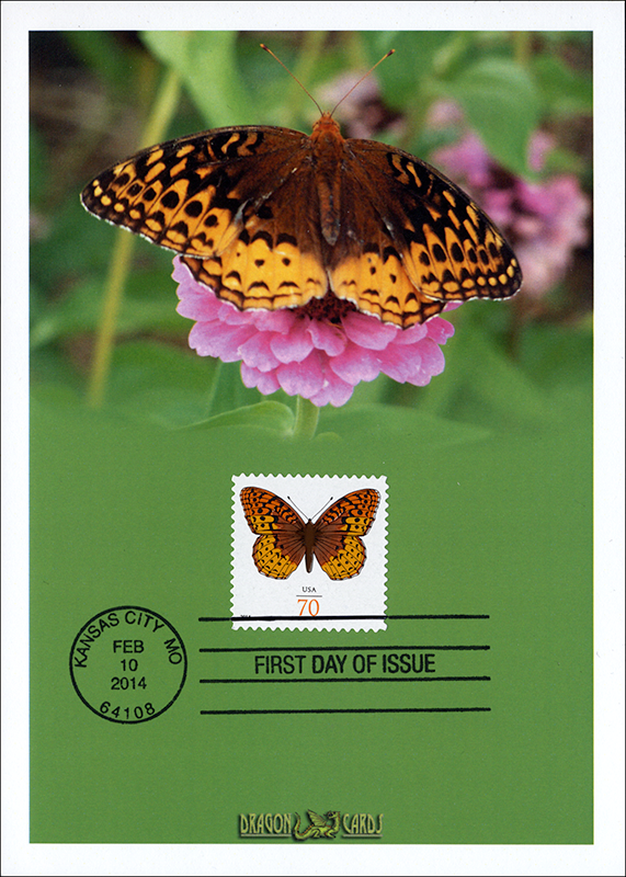 ![]() First Day Cover Great Spangled Fritillary Butterfly Dgn 498a $3.50 Sc. 4859 Great Spangled Fritillary Butterfly on a 5"x7" Dragon Card reproducing a photo of a butterfly atop a pink zinnia flower. The new stamp alone is tied to this card intended for the series combo by the First Day of Issue hand cancel. Great for a butterflies- or insects-on-stamps collection! |