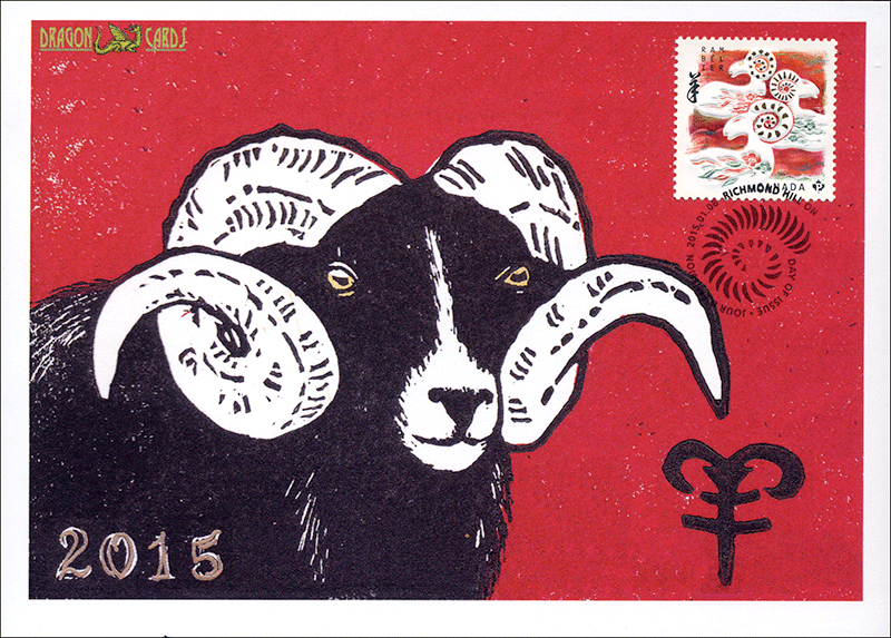 Sc. 2801 Year of the Ram on a 5”x7” Dragon Card reproducing an Asian-style print as if on rice paper. Canada’s domestic-rate stamp and first-day postmark. Great for a sheep-, goats-, animals- or Lunar Holidays-on-stamps collection!