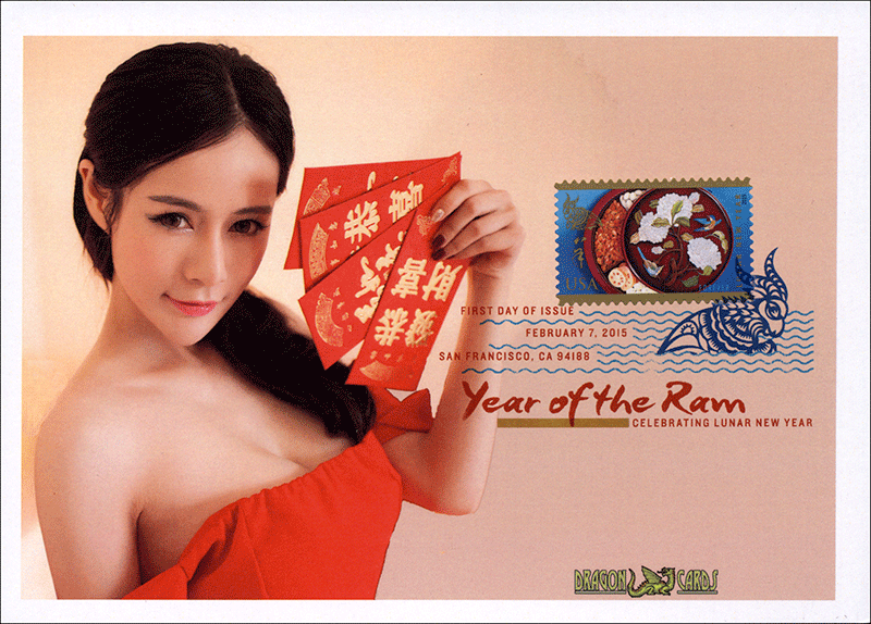 Sc. 4957 Year of the Ram on a 5”x7” Dragon Card showing an Chinese woman holding Lunar New Year Cards. Digital Color Postmark. Great for a sheep-, goats-, animals- or Lunar Holidays-on-stamps collection!