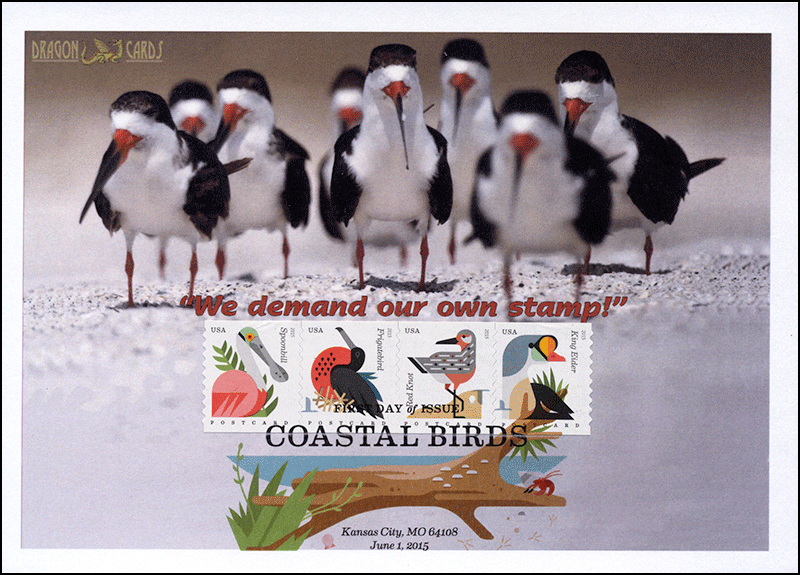 Sc. 4998a Coastal Birds on a 5”x7” Dragon Card with a photo of an angry-looking group of Black Skimmers on a beach and the caption, “We demand our own stamp!” Strip of 4 coil stamps, Digital Color Postmark. Great for a birds-on-stamps collection!