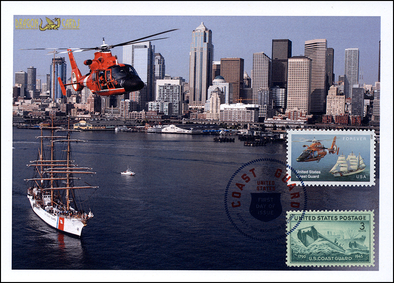 Sc. 5008 U.S. Coast Guard on a 5"x7" Dragon Card reproducing a USCG photo of the cutter Eagle and a MH-65 Dolphin helicopter, plus the Seattle skyline. Digital Color Postmark ties the new stamp and 1945's Sc. 936 Coast Guard. Great for a ships-, helicopters-, USCG- or military-on-stamps collection!