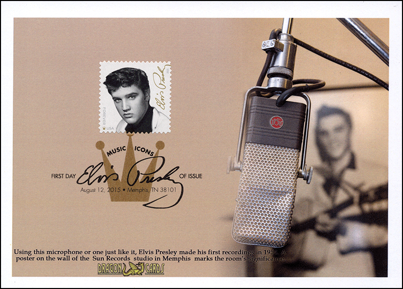 Sc. 5009 Elvis Presley on a 5”x7” Dragon Card showing a photo of an old microphone (possibly one Presley used) in the Sun Records studio, with a poster/photo of him in the background. Digital Color Postmark. Great for a music- or rock ‘n roll-on-stamps collection!