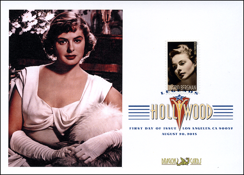 Sc. 5012 Ingrid Bergman on a 5”x7” Dragon Card reproducing a glamorous publicity photo. Digital Color Postmark. Great for a movies-, films- or Hollywood-on-stamps collection!