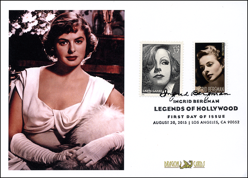 Sc. 5012 Ingrid Bergman on a 5”x7” Dragon Card reproducing a glamorous publicity photo. The Bergman and Greta Garbo (Sc. 3943) stamps are tied by the black-and-white pictorial first day postmark. Great for a movies-, films- or Hollywood-on-stamps collection!