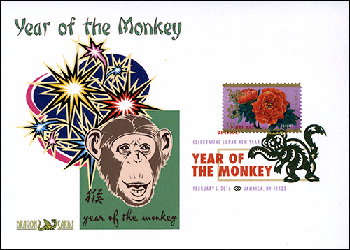 Sc. 5057 Year of the Monkey on a 5"x7" Dragon Card showing a Year of the Monkey icon and fireworks. Digital Color Postmark. Great for a lunar new year-, holidays- or monkeys-on-stamps collection!