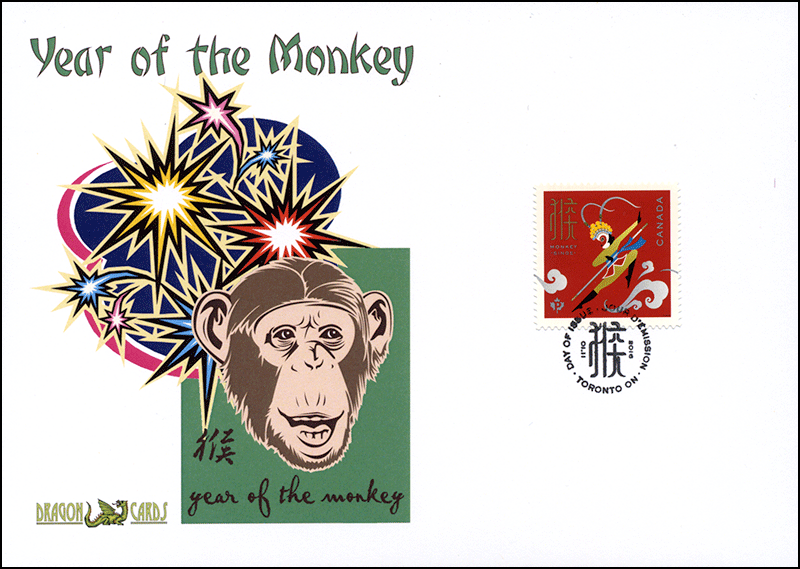Sc. 2884 Year of the Monkey on a Canada's domestic-rate stamp on a 5"x7" Dragon Card showing a Year of the Monkey icon and fireworks.. Great for a lunar new year-, holidays- or monkeys-on-stamps collection!