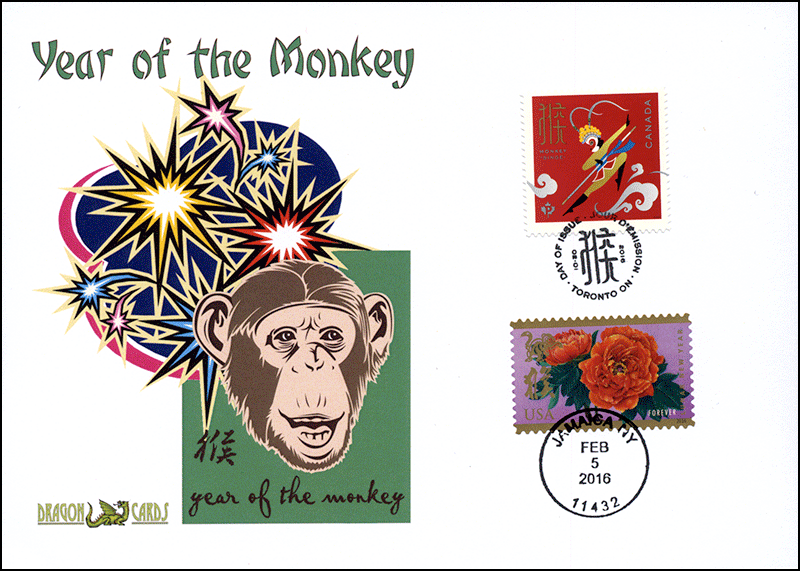 Sc. 2884/5057 Year of the Monkey on a 5"x7" Dragon Card showing a Year of the Monkey icon and fireworks. The U.S. and Canadian domestic-rate stamps are each tied by their respective first-day cancels (circular date stamp for U.S.). Great for a lunar new year-, holidays- or monkeys-on-stamps collection!