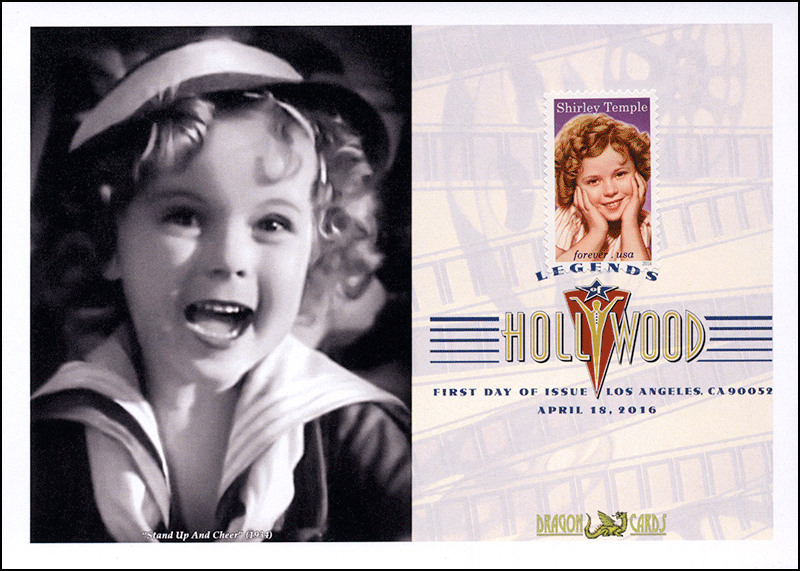 Sc. 5060 Shirley Temple on a 5½"x7½" Dragon Card featuring a still from "Stand Up And Cheer" (1934), her breakout movie. Digital Color Postmark. Great for a Hollywood-, movies-, film- or entertainment-on-stamps collection!