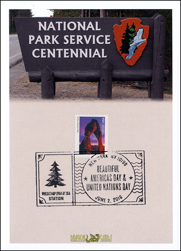 ![]() First Day Cover National Parks-Arches Dgn 587arsh $1.00 Sc. 5080h National Parks-Arches on a 5"x7" Dragon Card showing a sign similar to those that might be found at the entrance to a National Park. The sign reads "National Park Service Centennial." The Arches single is affixed by the World Stamp Show-New York pictorial postmark. The Parks stamps were issued at the show. Great for a parks- or conservation-on-stamps collection! |