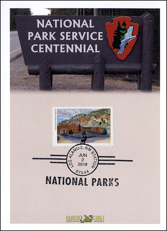 ![]() First Day Cover National Parks-Bandelier Dgn 587b $1.00 Sc. 5080k National Parks-Bandelier on a 5"x7" Dragon Card showing a sign similar to those that might be found at the entrance to a National Park. The sign reads "National Park Service Centennial." The Bandelier single is affixed by the hand cancel for that Park. Great for a parks- or conservation-on-stamps collection! |