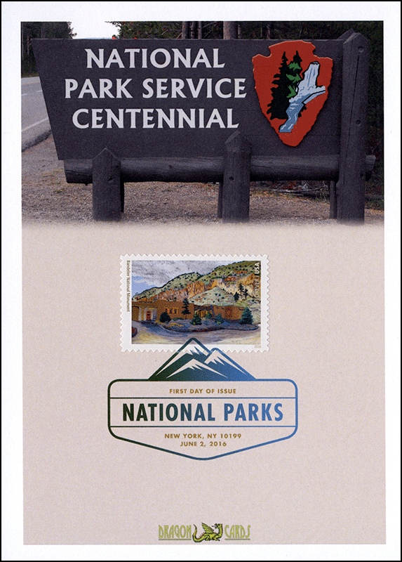 ![]() First Day Cover National Parks-Bandelier Dgn 587bd $1.00 Sc. 5080k National Parks-Bandelier on a 5"x7" Dragon Card showing a sign similar to those that might be found at the entrance to a National Park. The sign reads "National Park Service Centennial." The Bandelier single is affixed by the Digital Color Postmark. Great for a parks- or conservation-on-stamps collection! |