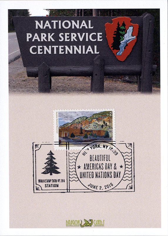 ![]() First Day Cover National Parks-Bandelier Dgn 587bsh $1.00 Sc. 5080k National Parks-Bandelier on a 5"x7" Dragon Card showing a sign similar to those that might be found at the entrance to a National Park. The sign reads "National Park Service Centennial." The Bandelier single is affixed by the World Stamp Show-New York pictorial postmark. The Parks stamps were issued at the show. Great for a parks- or conservation-on-stamps collection! |