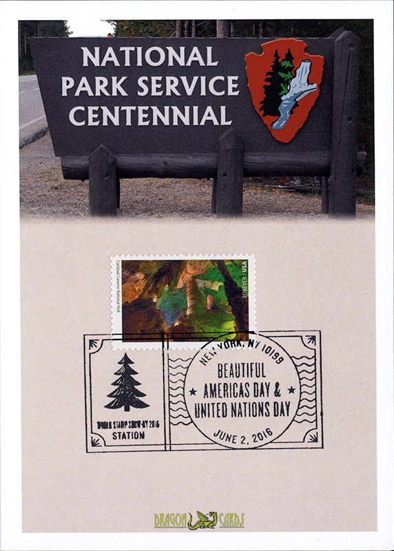 ![]() First Day Cover National Parks-Carlsbad Dgn 587csh $1.00 Sc. 5080o National Parks-Carlsbad on a 5"x7" Dragon Card showing a sign similar to those that might be found at the entrance to a National Park. The sign reads "National Park Service Centennial." The Carlsbad single is affixed by the World Stamp Show-New York pictorial postmark. The Parks stamps were issued at the show. Great for a parks- or conservation-on-stamps collection! |