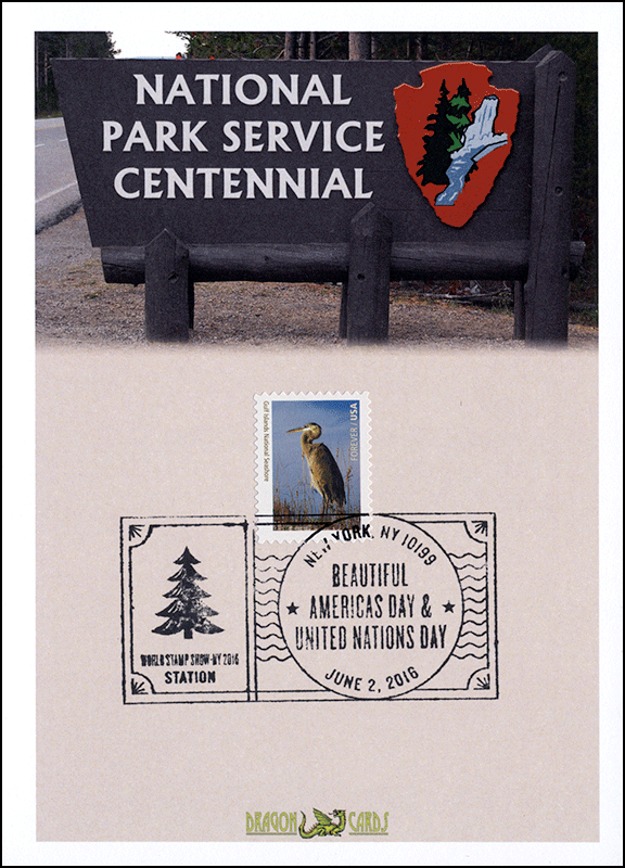 ![]() First Day Cover National Parks-Gulf Dgn 587gfsh $1.00 Sc. 5080p National Parks-Gulf on a 5"x7" Dragon Card showing a sign similar to those that might be found at the entrance to a National Park. The sign reads "National Park Service Centennial." The Gulf Islands single is affixed by the World Stamp Show-New York pictorial postmark. The Parks stamps were issued at the show. Great for a parks- or conservation-on-stamps collection! |