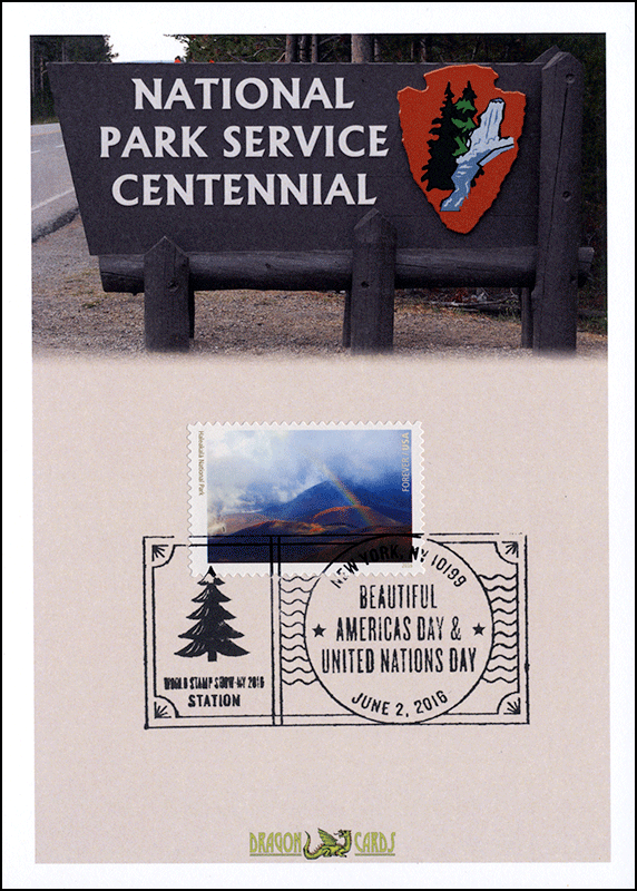 ![]() First Day Cover National Parks-Haleakala Dgn 587hsh $1.00 Sc. 5080m National Parks-Haleakala on a 5"x7" Dragon Card showing a sign similar to those that might be found at the entrance to a National Park. The sign reads "National Park Service Centennial." The Haleakala single is affixed by the World Stamp Show-New York pictorial postmark. The Parks stamps were issued at the show. Great for a parks- or conservation-on-stamps collection! |