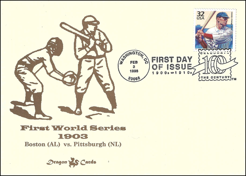 Sc. 3182n Century: World Series single from the Celebrate the Century 1900s sheet on a 5"x7" sepia-on-cream Dragon Card, showing a drawing of a batter, catcher and umpire in period uniforms. First Day of Issue hand cancel. Great for a baseball- or sports-on-stamps collection!