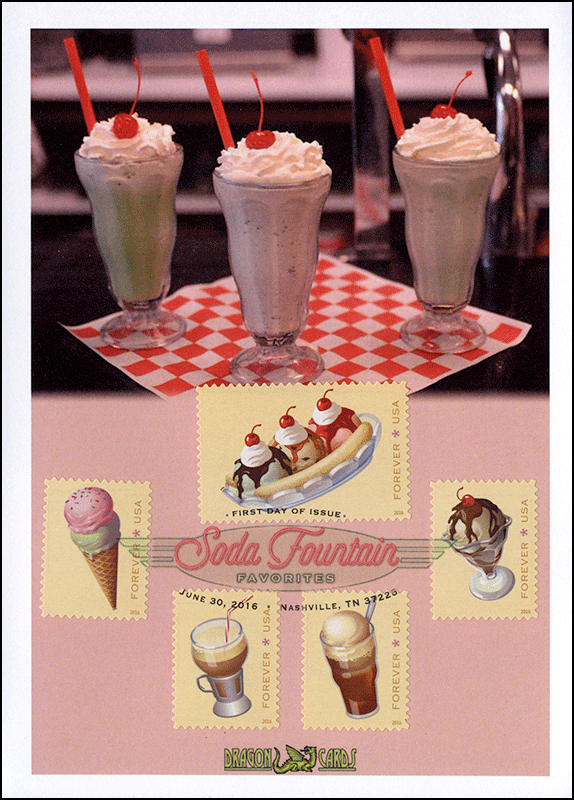 ![]() | ![]() First Day Cover Soda Fountain Favorites Dgn 590 $7.00 Sc. 5093-7 Soda Fountain Favorites on a 5"x7" Dragon Card reproducing a photo of milkshakes at the Elliston Place Soda Shop in Nashville, where the first-day ceremony was held. Digital Color Postmark. Great for an ice cream-, sweets-, or food-on-stamps collection! |