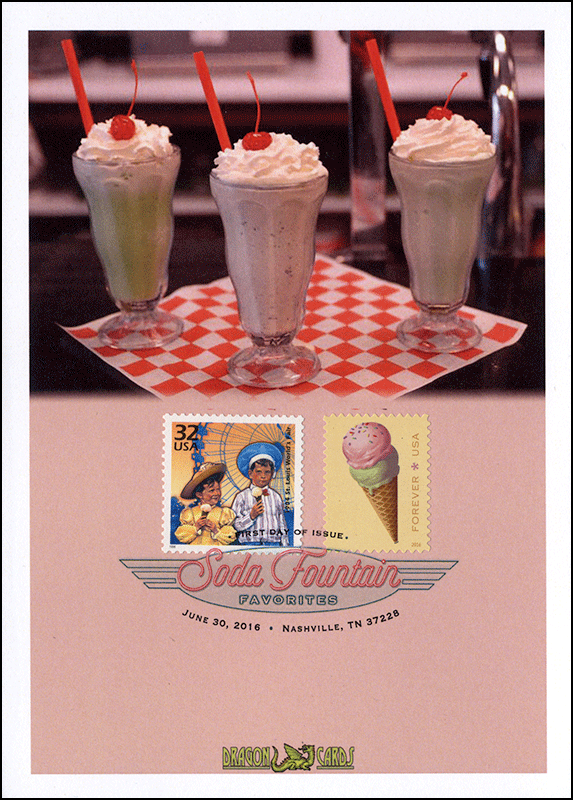 5093 Soda Fountain Favorites on a 5"x7" Dragon Card reproducing a photo of milkshakes at the Elliston Place Soda Shop in Nashville, where the first-day ceremony was held. The ice cream cone stamp and the 1904 St. Louis World's Fair stamp from the Celebrate the Century series (Sc. 3182e) are tied by the Digital Color Postmark. The CTC stamp shows kids eating ice cream cones. The waffle-style cone was introduced at the Fair. Great for a ice cream-, sweets-, or food-on-stamps collection! |
