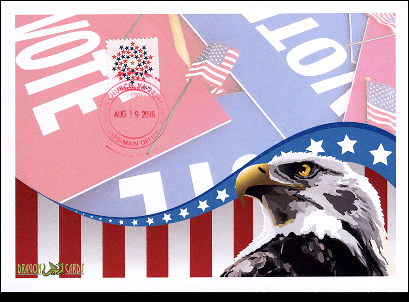 eagle, stars & stripes and "Vote" signs. Red registry plug