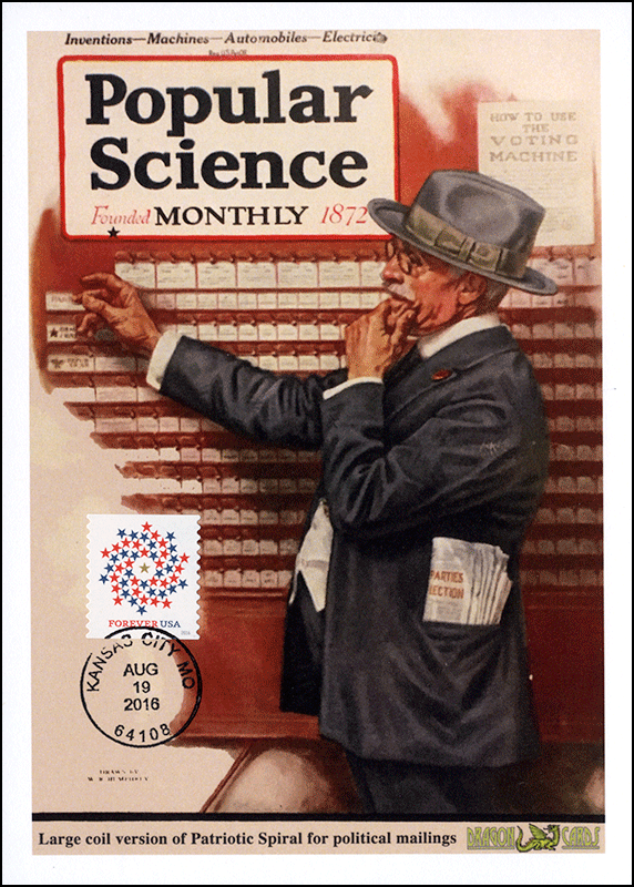 ![]() | ![]() First Day Cover Patriotic Spiral Dgn 594 $2.50 Sc. 5131 Patriotic Spiral on a 5"x7" Dragon Card reproducing the front cover of the November 1920 issue of Popular Science magazine, showing a man in a “modern” voting booth. The coil version of this stamp was issued for large political mailings. First Day of Issue circular date stamp ties a single stamp. Great for a flags-, patriotism- or elections-on-stamps collection! |