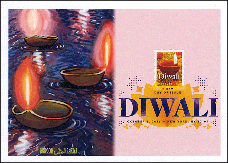 Sc. 5142 Diwali on a 5"x7" Dragon Card showing art of a diya oil lamp. Digital Color Postmark. Great for a holidays- or Hindu-on-stamps collection!