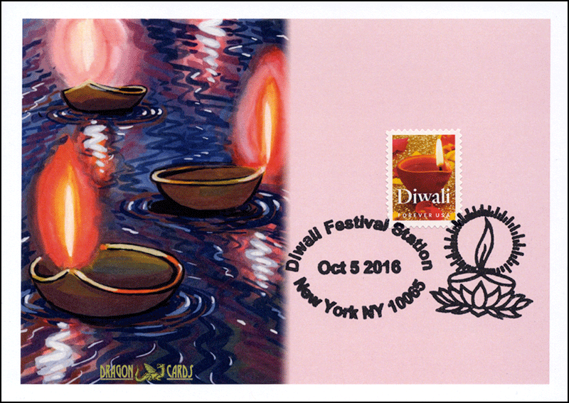 Sc. 5142 Diwali on a 5"x7" Dragon Card showing art of a diya oil lamp. Diwali Festival Station (NYC) hand cancel on the first day showing a diya. Great for a holidays- or Hindu-on-stamps collection!