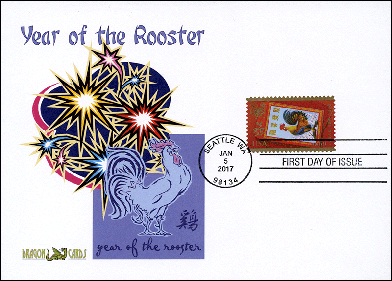 Sc. 5154 Year of the Rooster on a 5"x7" Dragon Card showing a Year of the Rooster icon and fireworks. First Day of Issue hand cancel. Great for a lunar new year-, holidays-, chickens- or birds-on-stamps collection!