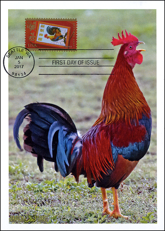 5154 Year of the Rooster on a 5"x7" Dragon Card featuring a photo of a feral rooster in Hawaii, where apparently there is a large population of wild chickens. First Day of Issue Hand Cancel. Great for a lunar new year-, holidays-, chickens- or birds-on-stamps collection! |