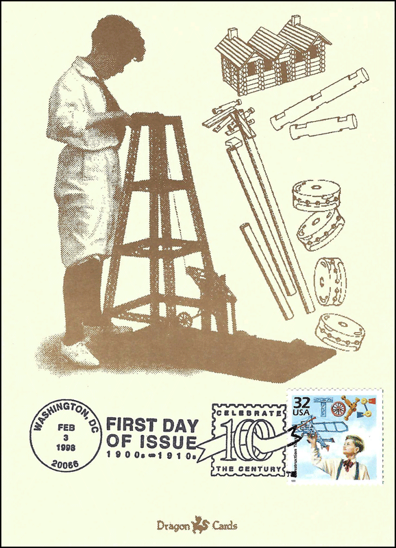 ![]() First Day Cover Century: Construction Toys Dgn 62 $3.00 Sc. 3183n Century: Construction Toys single from the Celebrate the Century sheet on a 5"x7" sepia-on-cream Dragon Card, showing a photo of a boy playing with an Erector Set and drawings of Lincoln Logs and Tinker Toys. First Day of Issue hand cancel. Great for a toys-, Erector Sets-, Lincoln Logs-, or Tinker Toys-on-stamps collection! |