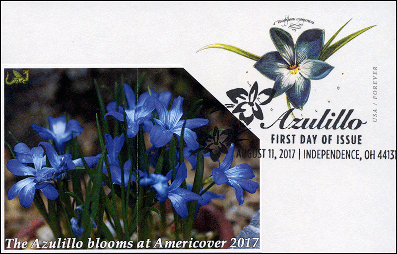 Sc. UX647 Azulillo card on a a label cachet showing azulillo flowers. It is tied to the stamped card by the first-day pictorial postmark. This is one of 3 designs produced by Dragon Cards for this issue. Great for a flowers--on-stamps collection!