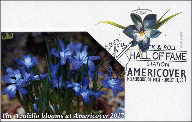 Sc. UX647 Azulillo card on a a label cachet showing azulillo flowers. It is tied to the stamped card by the Americover 2017 pictorial postmark. The Azulillo card was issued at the show. This is one of 3 designs produced by Dragon Cards for this issue. Great for a flowers-on-stamps collection!