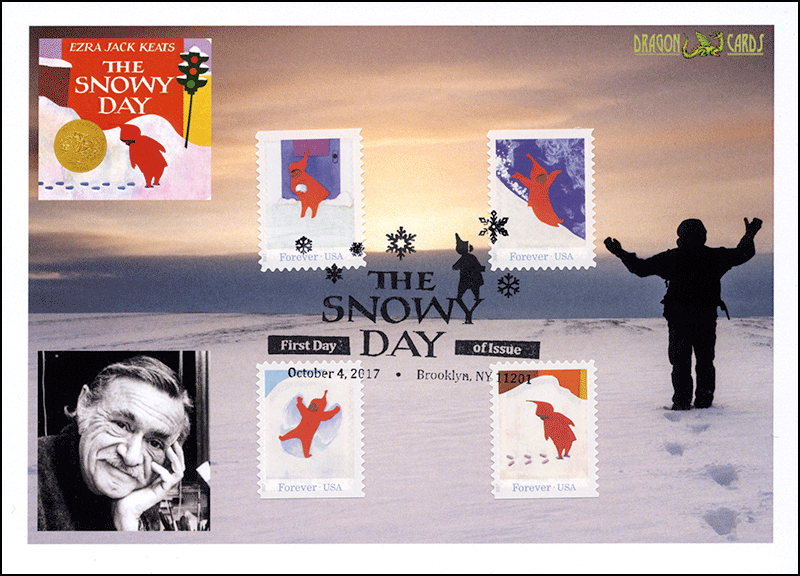 Sc. 5243-6 The Snowy Day on a 5"x7" Dragon Card reproducing a photograph of a child in silhouette playing in the snow, with vignettes of the book cover and Ezra Jack Keats. The four stamps are affixed separately and tied by the pictorial first-day postmark in the center. Great for a Black History-, literature- or children-on-stamps collection!