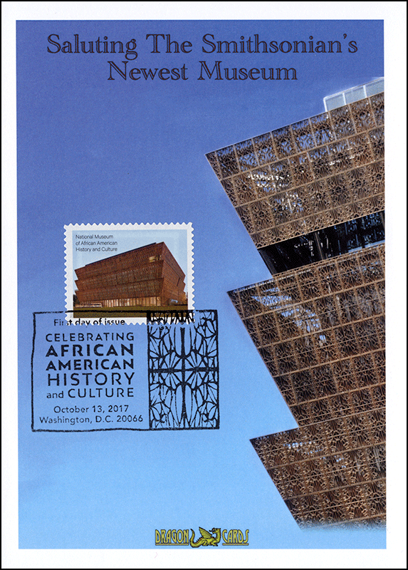 5251 African American Museum on a 5"x7" Dragon Card featuring a modified photograph of the edge of the Museum building. Pictorial first-day postmark. Great for a Black History-on-stamps collection! |
